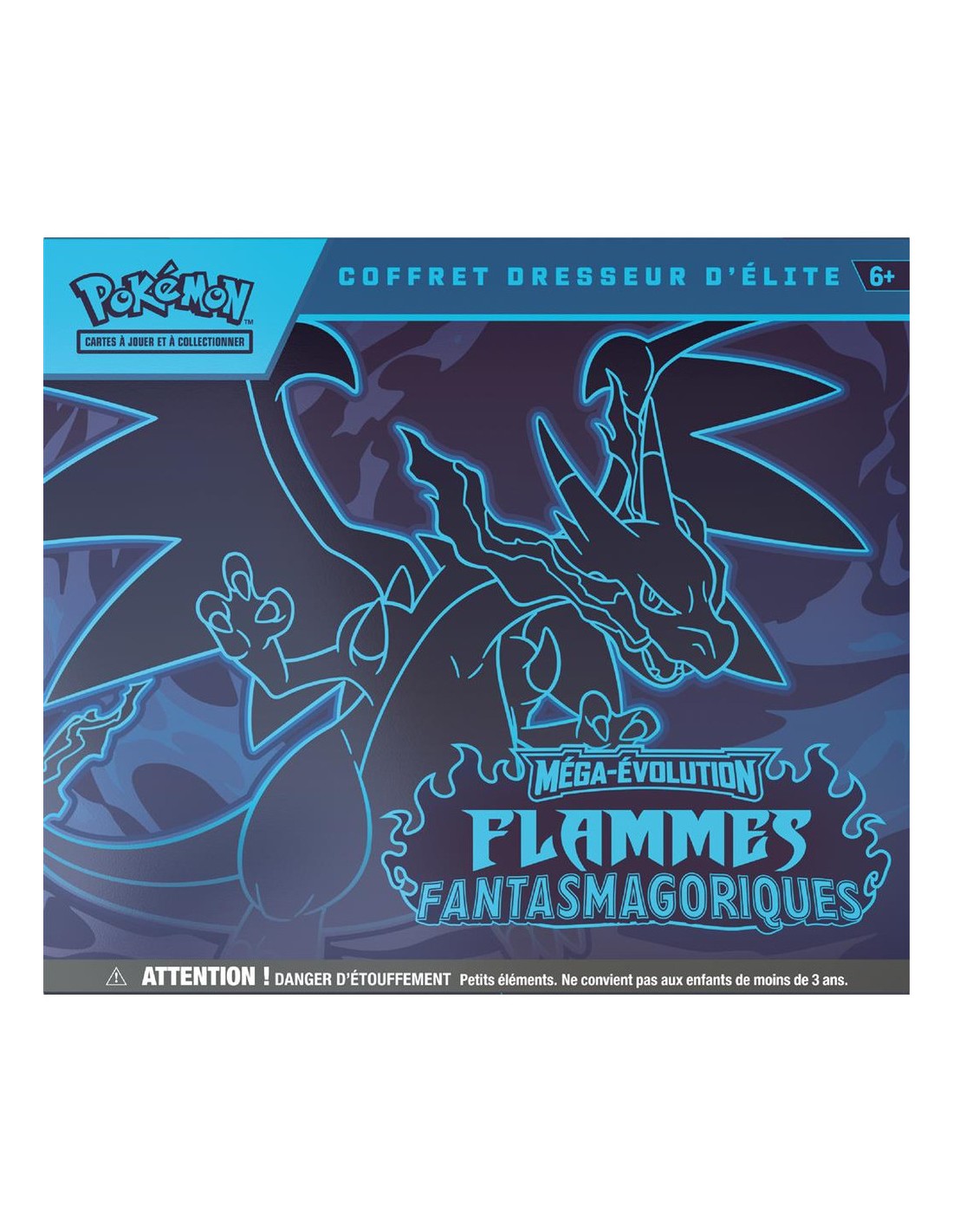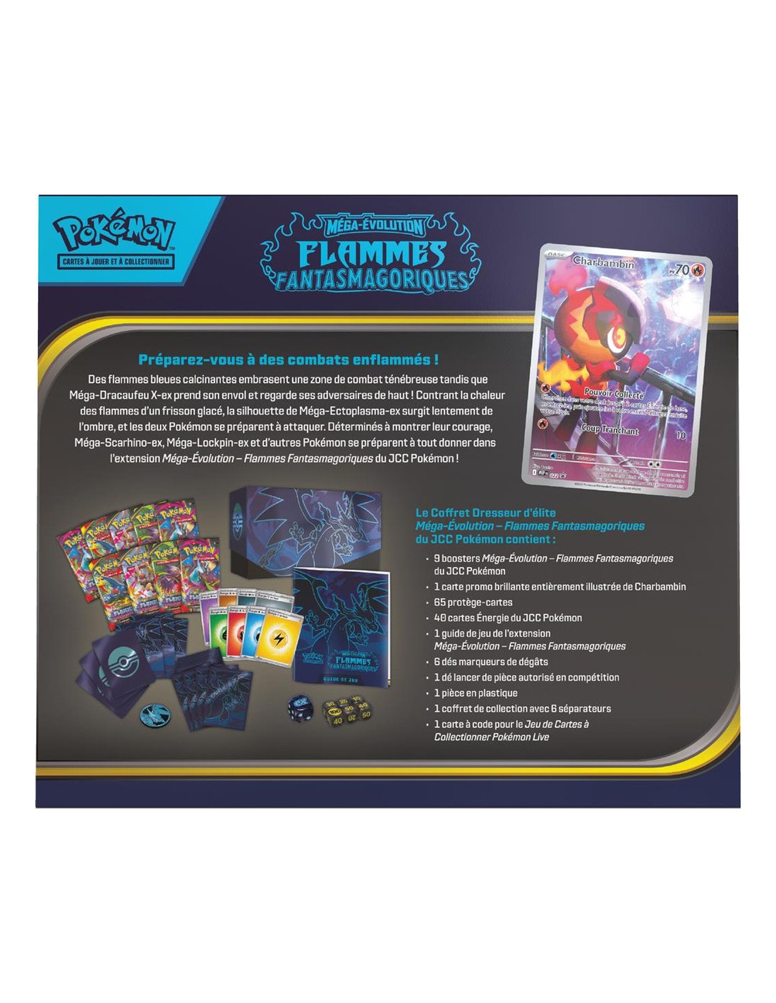 Contenu : 9 boosters Méga-Évolution - Flemmes Fantasmagoriques du Jcc Pokémon, 1 carte promo brillante entièrement illustrée de Charbambin, 65 protège-cartes, 40 cartes Énergie du Jcc Pokémon, 1 guide du jeu de l'extension Méga-Évolution - Flammes Fantasmagoriques, 6 dés marqueurs de dégâts, 1 dé lancer de pièce autorisé en compétition, 1 pièce en plastique, 1 coffret de collection avec 6 séparateurs, 1 carte à code pour le Jeu d Cartes à Collectionner Pokémon Live