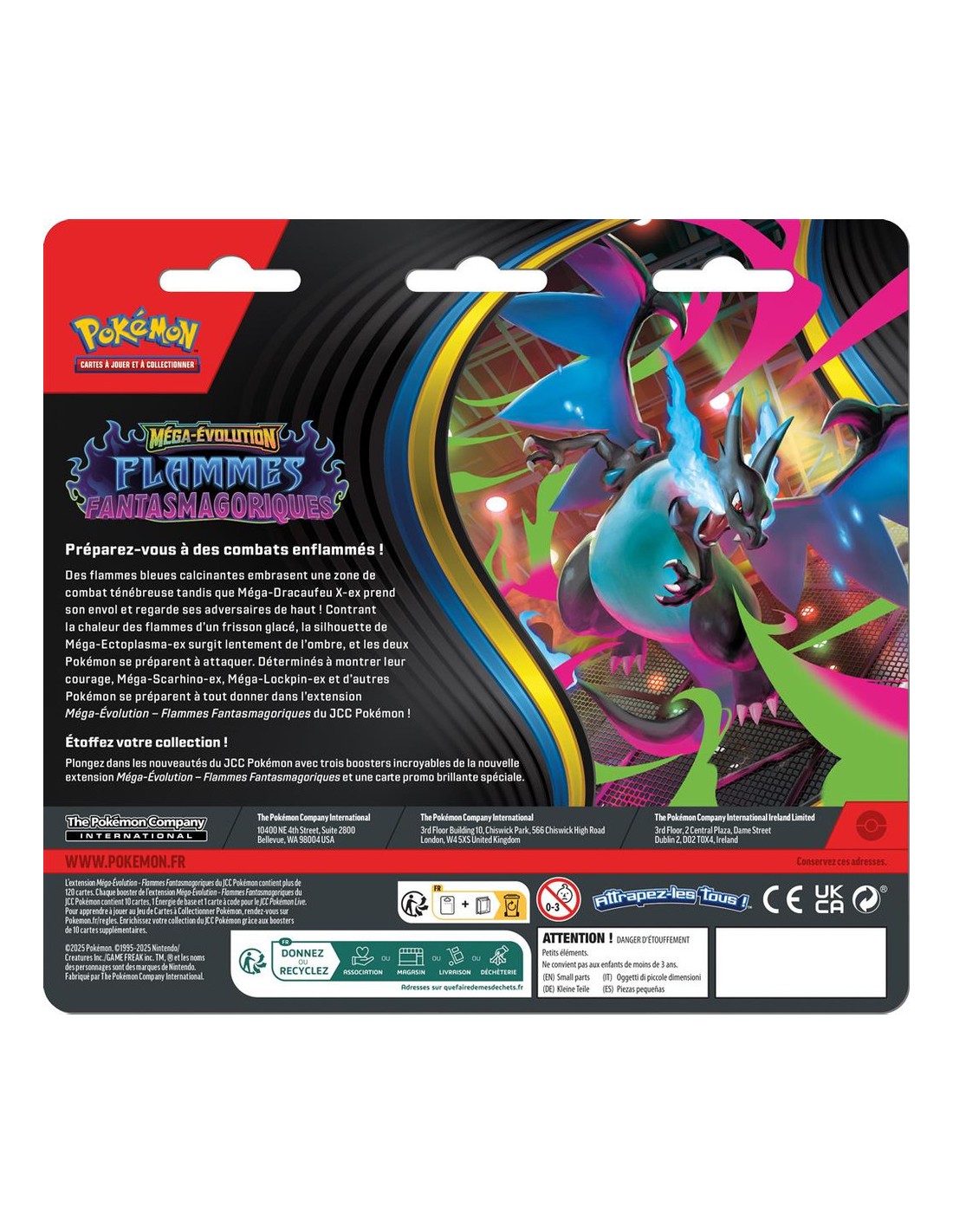 Des flammes bleues calcinantes embrasent une zone de combat télébreuse tandis que Méga-Dracaufeu X-ex prend son envol et regarde ses adversaires de haut ! Contrant la chaleur des flammes d'un frisson glacé, la silhouette de Méga-Ectoplasma-ex surgit lentement de l'ombre, et les deux Pokémon se préparent à attaquer.
