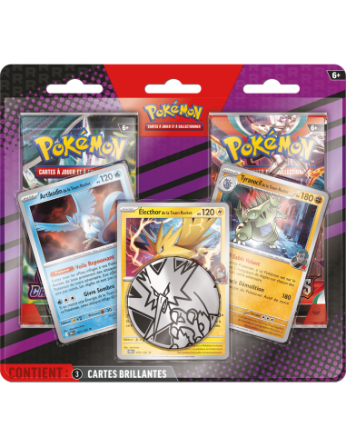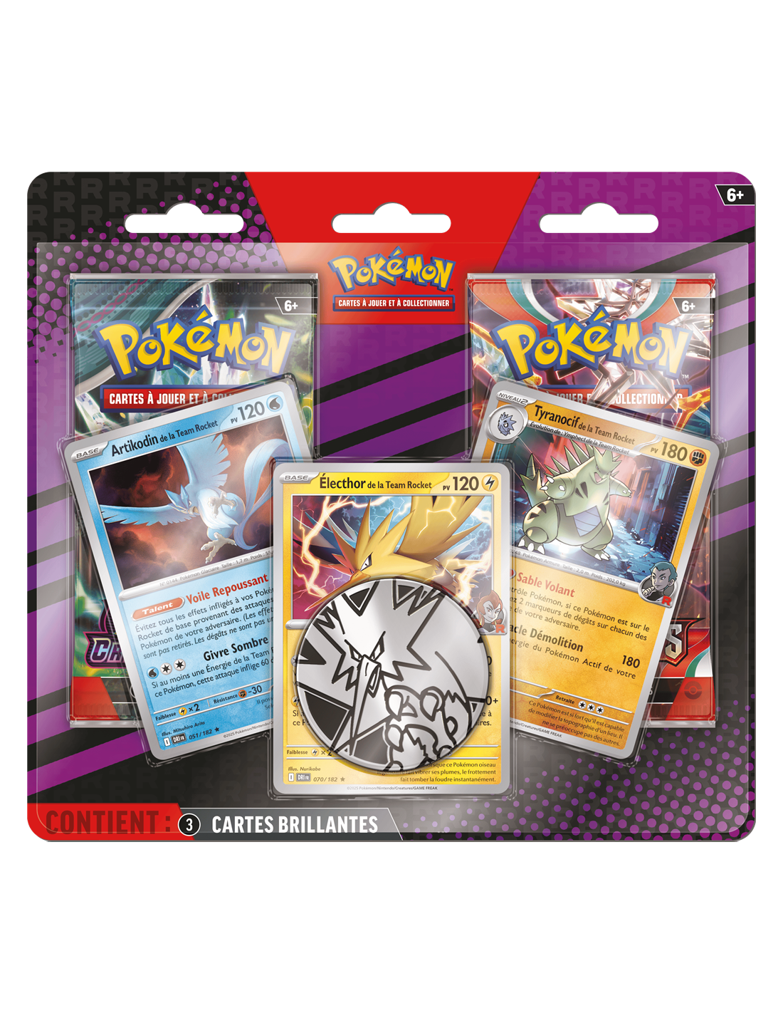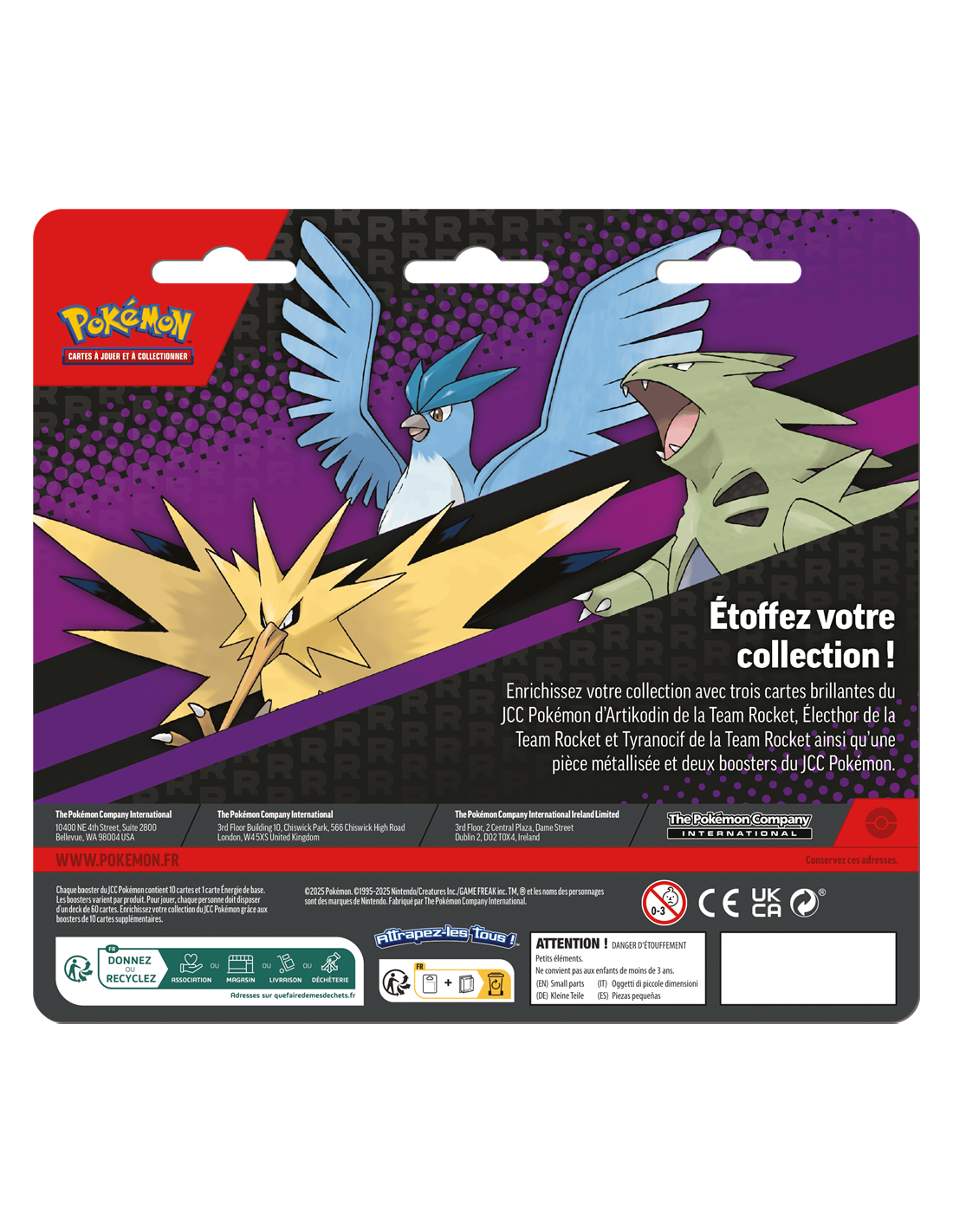 Enrichissez votre collection avec trois cartes brillantes du JCC Pokémon d'Artikodin de la Team Rocket, Électhor de la Team Rocket et Tyranocif de la Team Rocket, plus une pièce métallisée et deux boosters du JCC Pokémon.