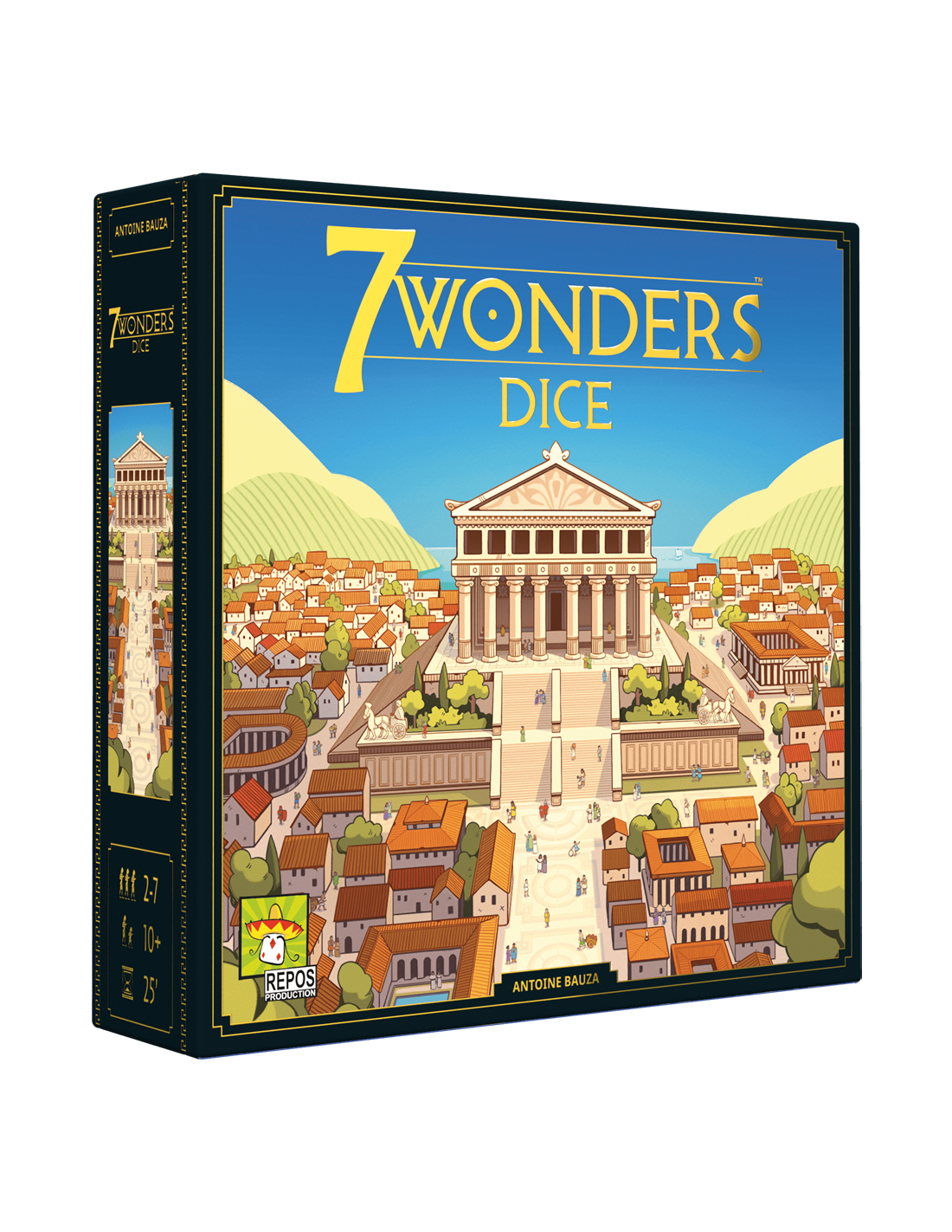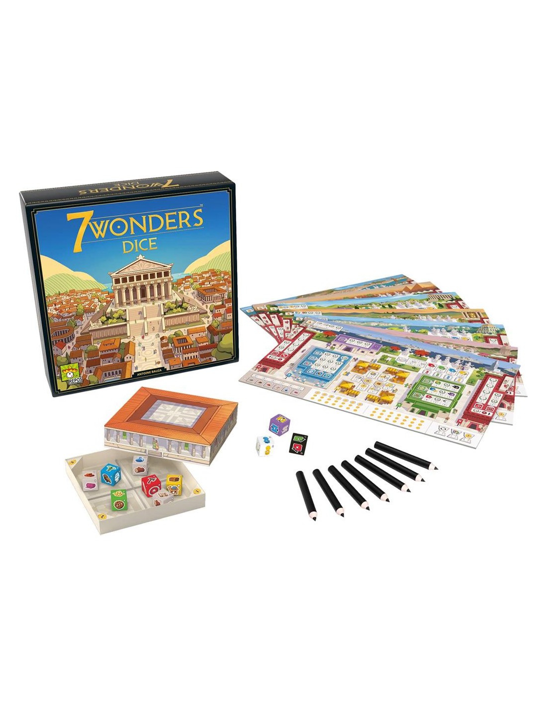 Dans 7 Wonders Dice, chaque joueur fait prospérer sa cité antique en lançant des dés et en construisant bâtiments et Merveille.