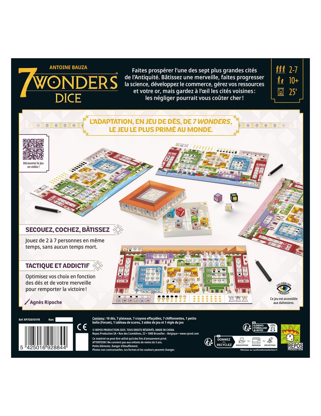 Dans 7 Wonders Dice, construisez une merveille qui défie le temps, faites des progrès scientifiques, développez le commerce, gérez vos ressources et votre réserve d'or avec prudence, tout en gardant un œil sur les villes voisines, car les ignorer se paie très cher ! Grâce à un système de choix simultané et des actions variées, ce roll & write offre des parties dynamiques, pleines de dilemmes stratégiques. N’oubliez pas de surveiller les cités voisines !Une partie se déroule en plusieurs tours au cours desquels vous utilisez des dés pour construire votre ville. À la fin de la partie, comptez tous vos points pour savoir qui a le score le plus élevé. Contenu:
