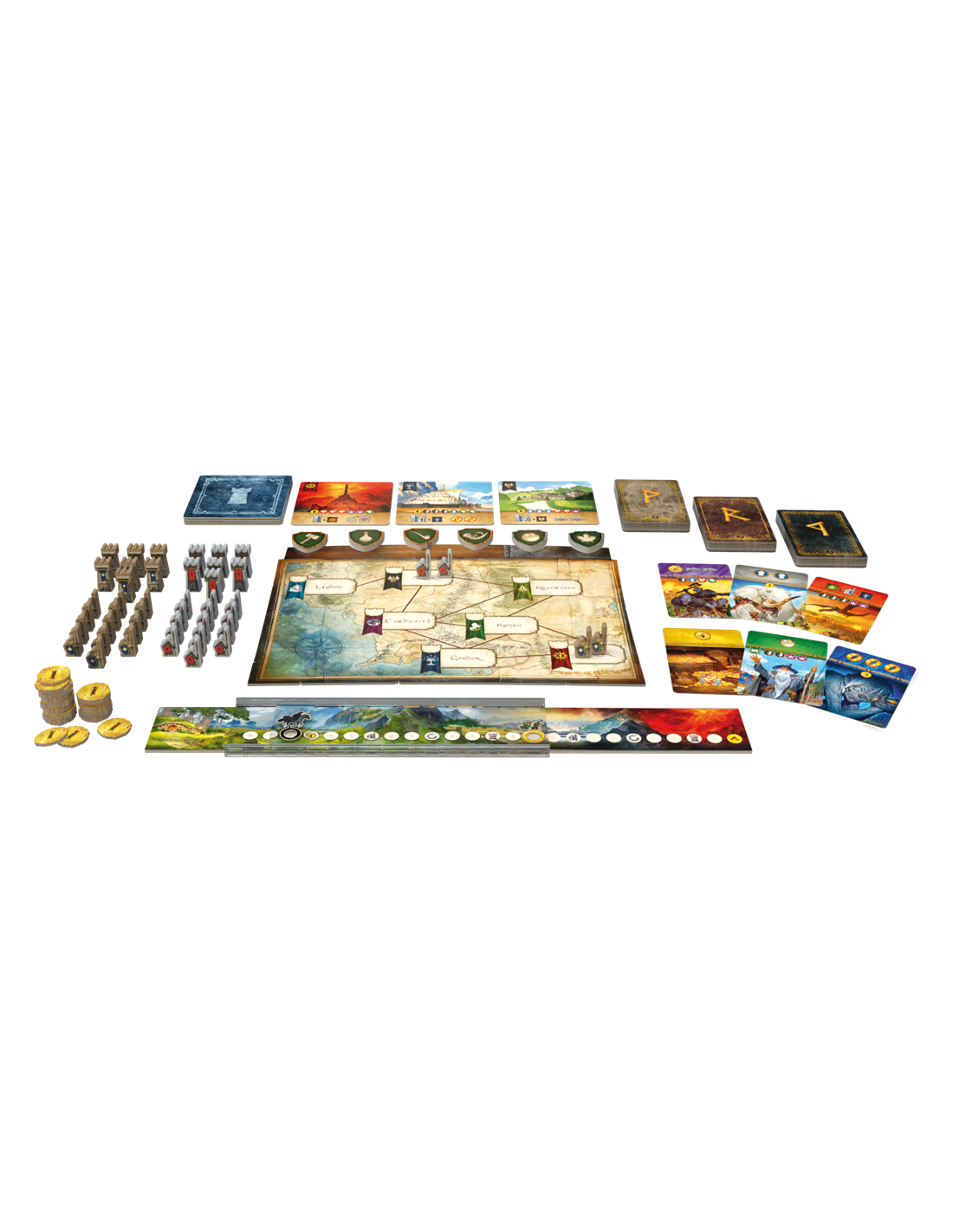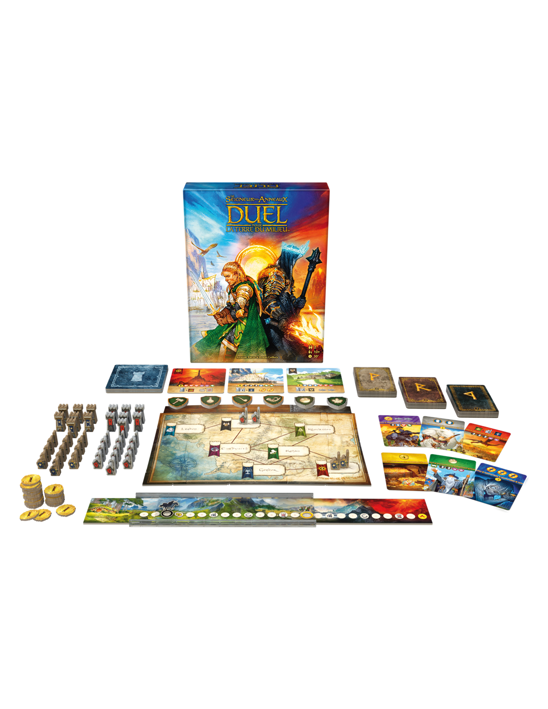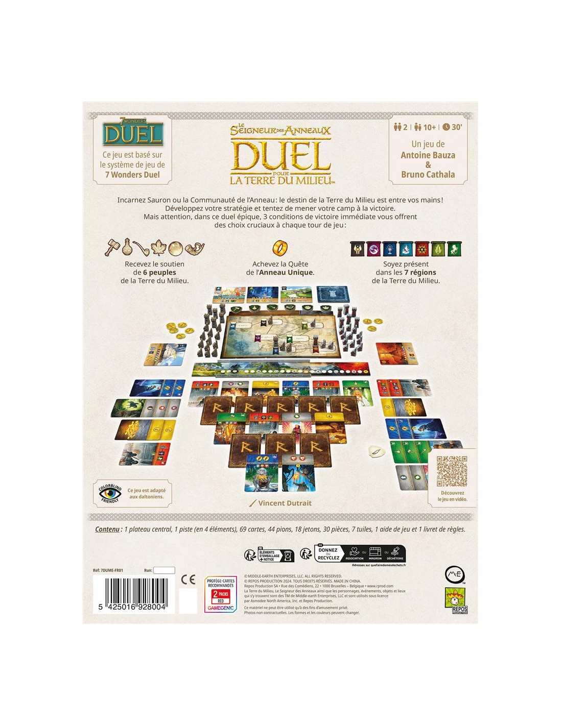 Vous remportez immédiatement la partie en remplissant l’une des 3 conditions de victoire : accomplir la Quête de l’Anneau (ou rattraper Frodon), rassembler le soutien de 6 Peuples différents, ou conquérir la Terre du Milieu. Un jeu s’inspirant des mécaniques de 7 Wonders Duel. Contenu