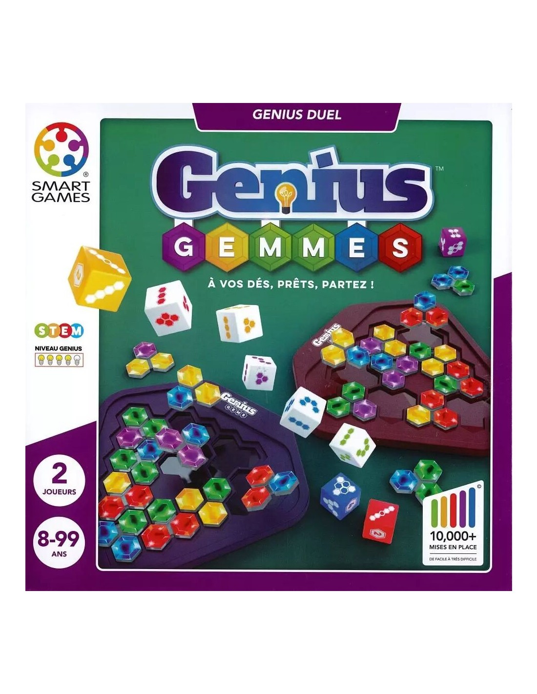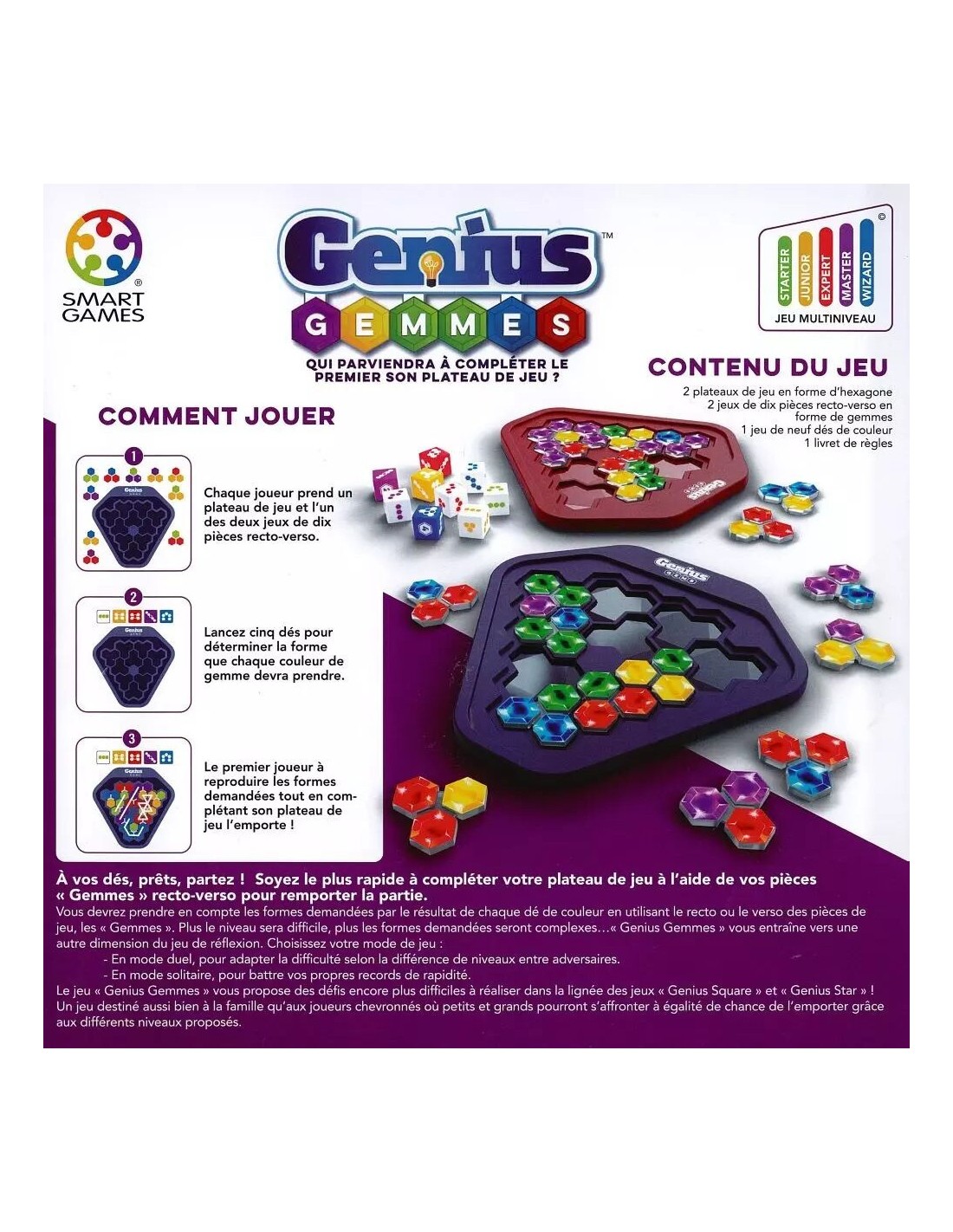 Vous devrez prendre en compte les formes demandées par le résultat de chaque dé de couleur en utilisant le recto ou le verso des pièces de jeu, les « Gemmes ». Plus le niveau sera difficile, plus les formes demandées seront complexes… « Genius Gemmes » vous entraîne vers une autre dimension du jeu de réflexion.