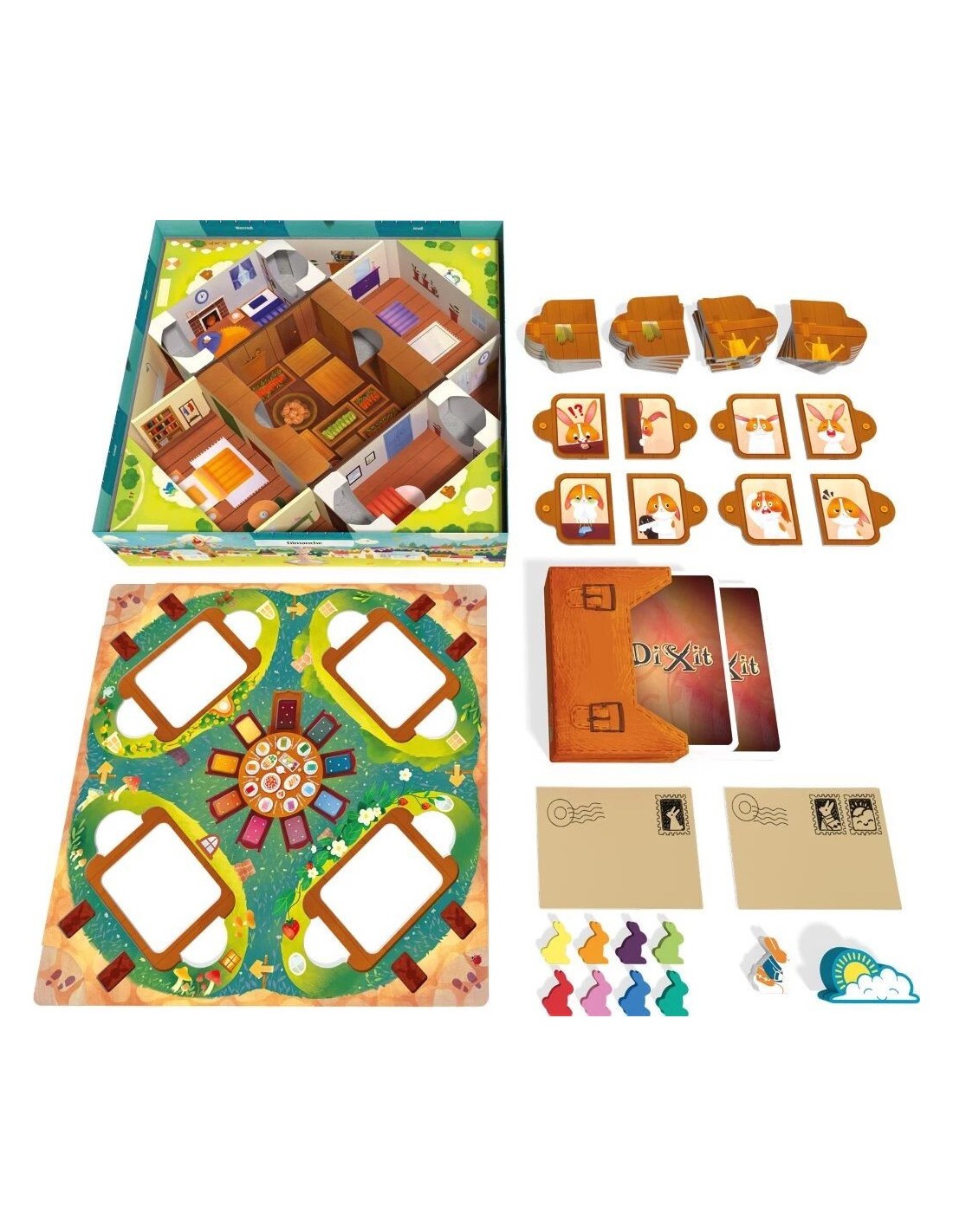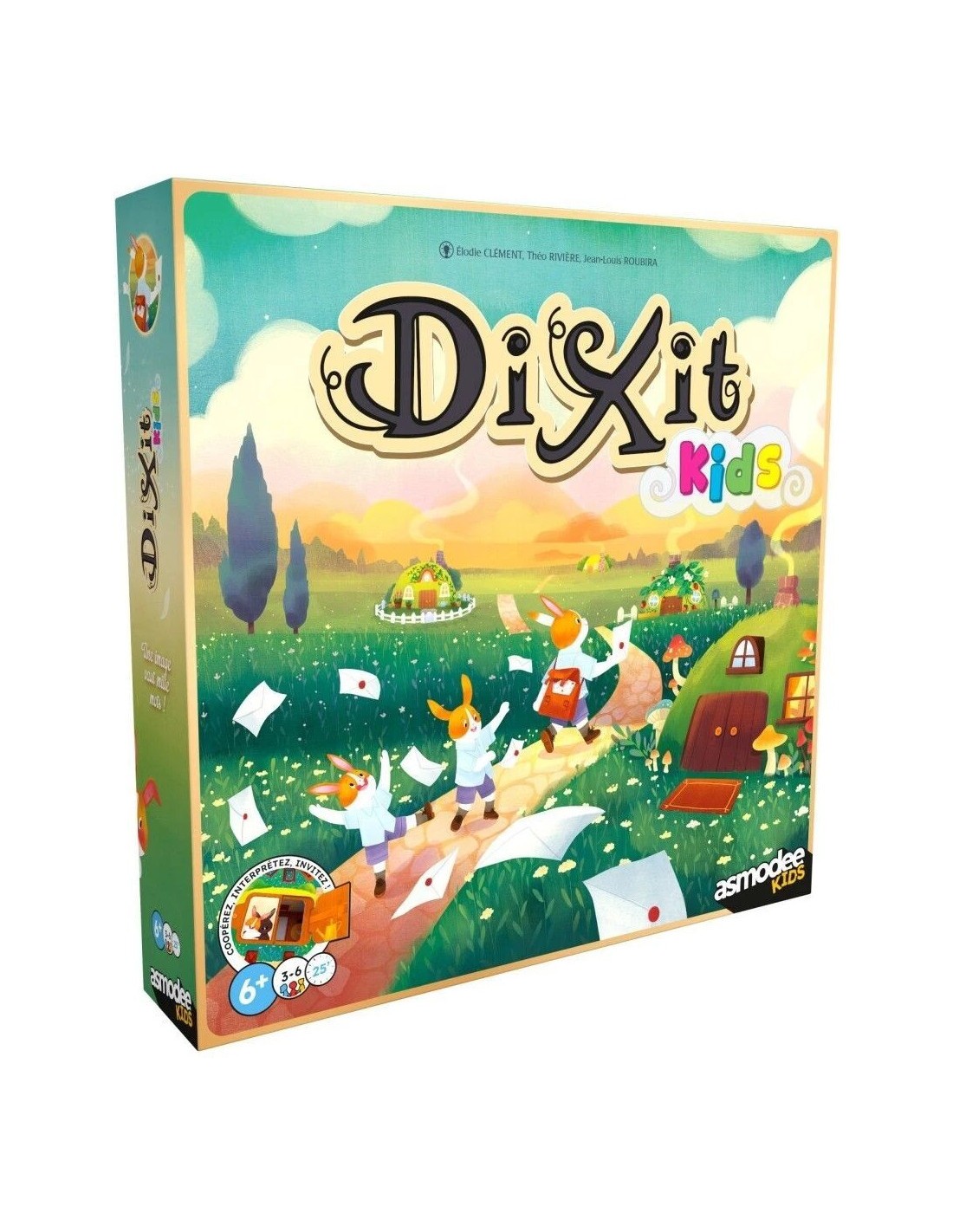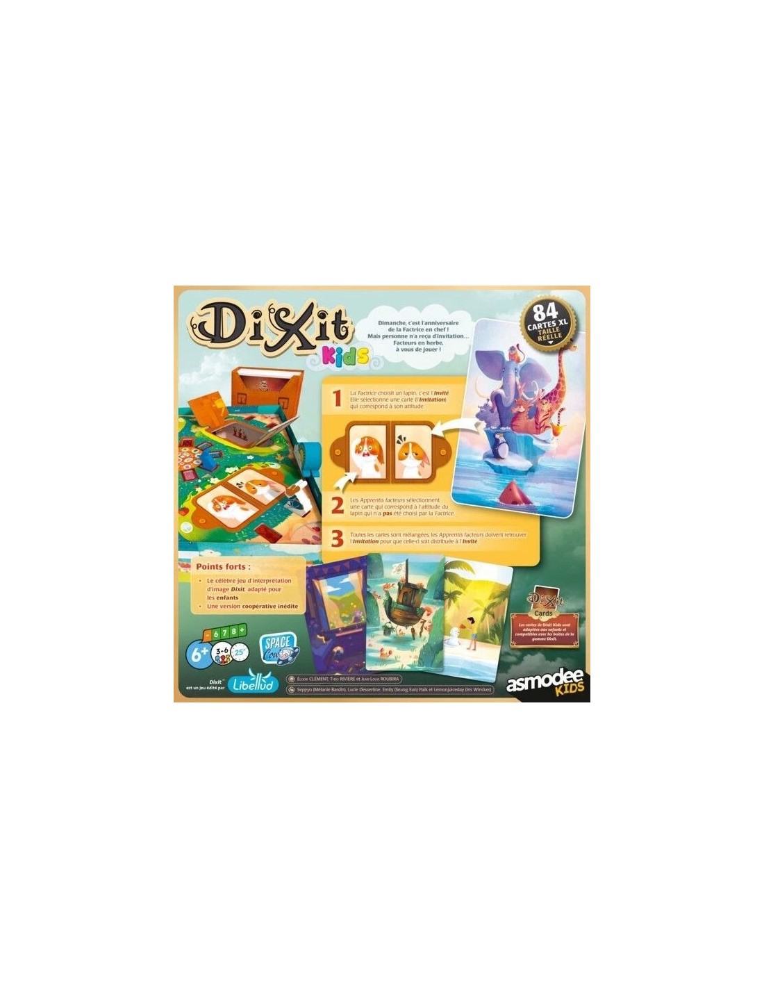 Dans le jeu Dixit Kids, les joueurs retrouvent toute la magie poétique de Dixit, mais dans une version simplifiée et totalement adaptée aux enfants. Le principe est coopératif : l’un des joueurs incarne la Factrice et choisit un lapin, l’Invité, auquel il associe une carte Invitation.