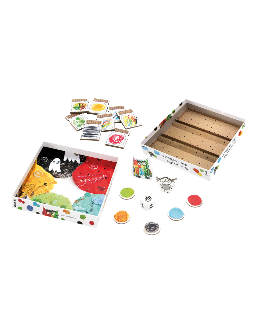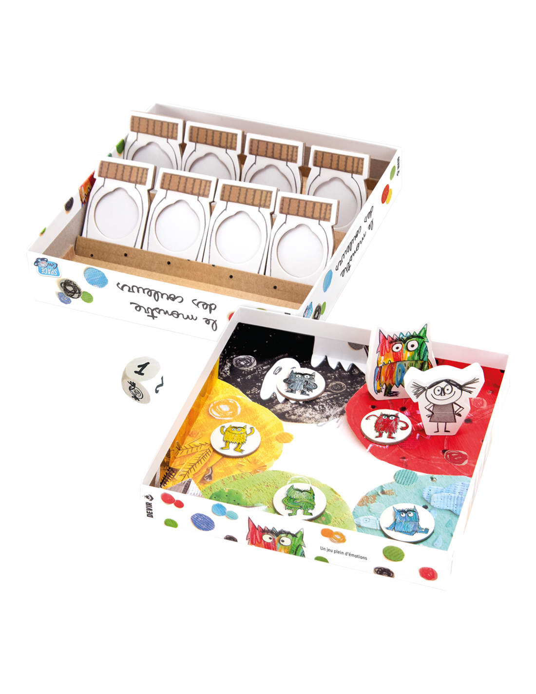 En jouant avec lui, vous lui montrez que les grands aussi vivent des émotions fortes ! De beaux moments de complicité à partager. Le design coloré et amusant rappelant le livre, et les éléments solides adaptés aux petites mains, renforcent le plaisir de jouer pour votre bambin. Contenu :1 plateau au fond de la boîte, 1 jeton de Monstre, 1 jeton de petite fille, un dé, 8 jarres en carton, 2 étagères pour les jarres, 5 marqueurs d'émotion.
