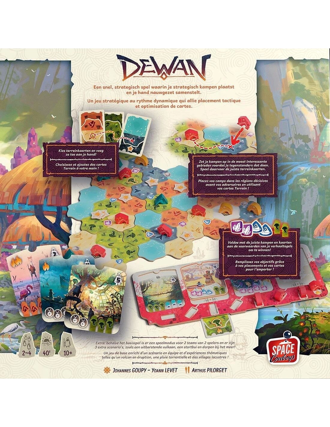 Plongez dans l’univers chatoyant de Dewan, avec son univers post-apocalyptique coloré et reposant... Dans ce jeu, vous n’attaquez jamais vos adversaires… mais vous rivalisez d’ingéniosité pour occuper les zones les plus lucratives avant eux. Ici, pas de combats ni de confrontation directe, mais une lutte subtile pour optimiser vos placements et marquer le plus de points.