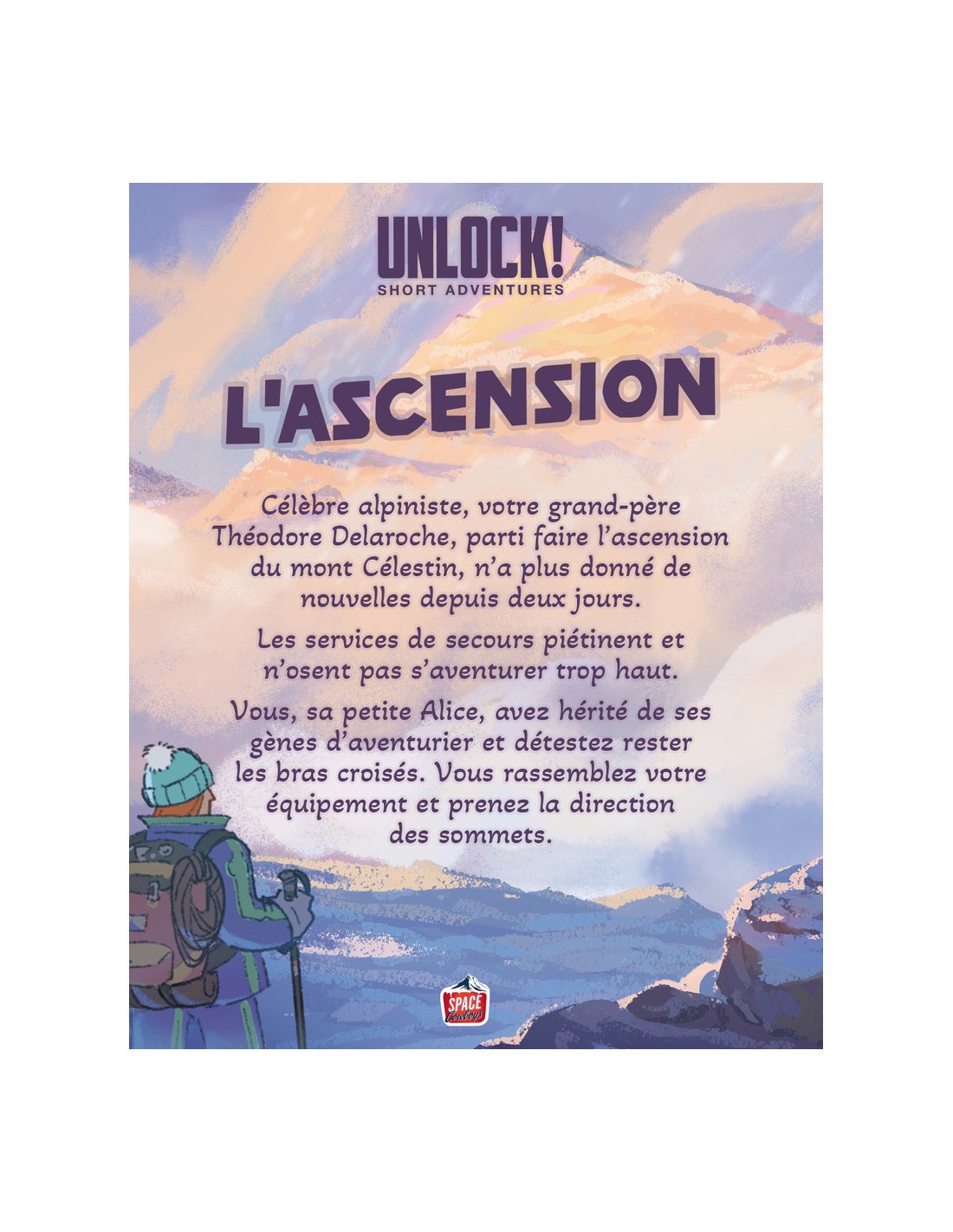 Prenez de l'altitude avec l'Ascension, une aventure originale en haute montagne. Votre grand-père, un célèbre alpiniste, est parti pour l'ascension du Mont Célestin mais n'a pas donné de signe de vie depuis deux jours. Les services de secours n'osent pas s'aventurer à sa recherche. A vous, qui avait hérité de ses gènes d'aventurier, de prendre la direction des sommets. Cette aventure de niveau de difficulté 2 convient aux novices comme aux joueurs plus expérimentés.