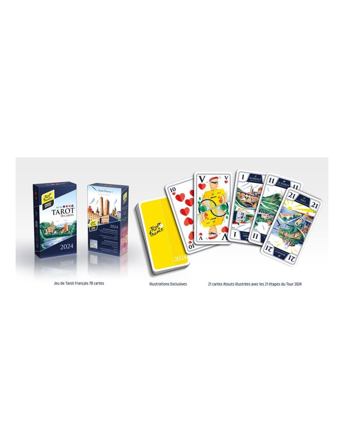 Cette édition est vendue exclusivement pendant l’année du Tour de France 2024. Une édition suivant le parcours 2025 verra le jour l’année prochaine et ainsi de suite. Âmes collectionneuses, vous voilà averties ! En plus du jeu de tarot classique, découvrez une règle spéciale pour jouer le classement général comme si vous y étiez !