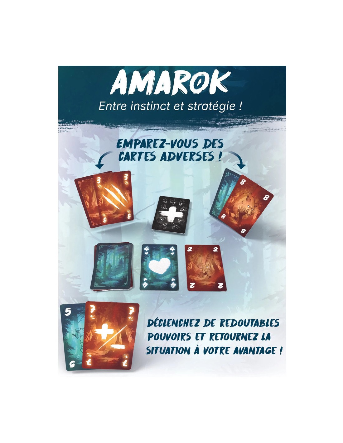 Amarok est un jeu compétitif et familial de déduction et de bluff ! Entre instinct et stratégie, emparez-vous des cartes adverses et déclenchez de redoutables pouvoir pour retourner la situation à votre avantage.