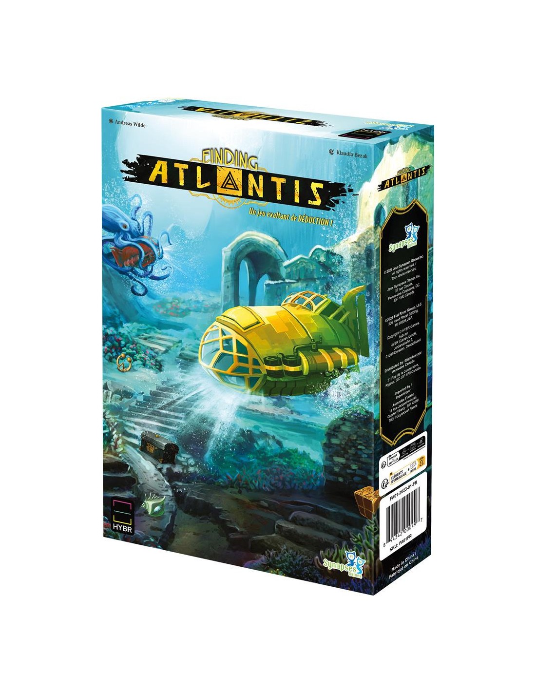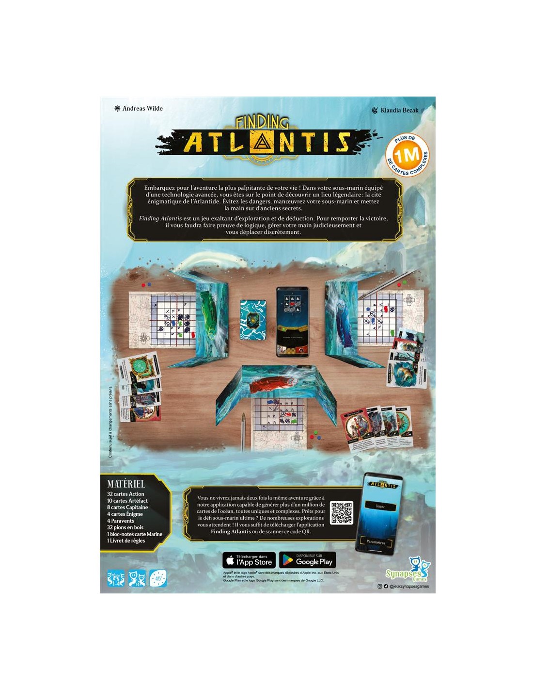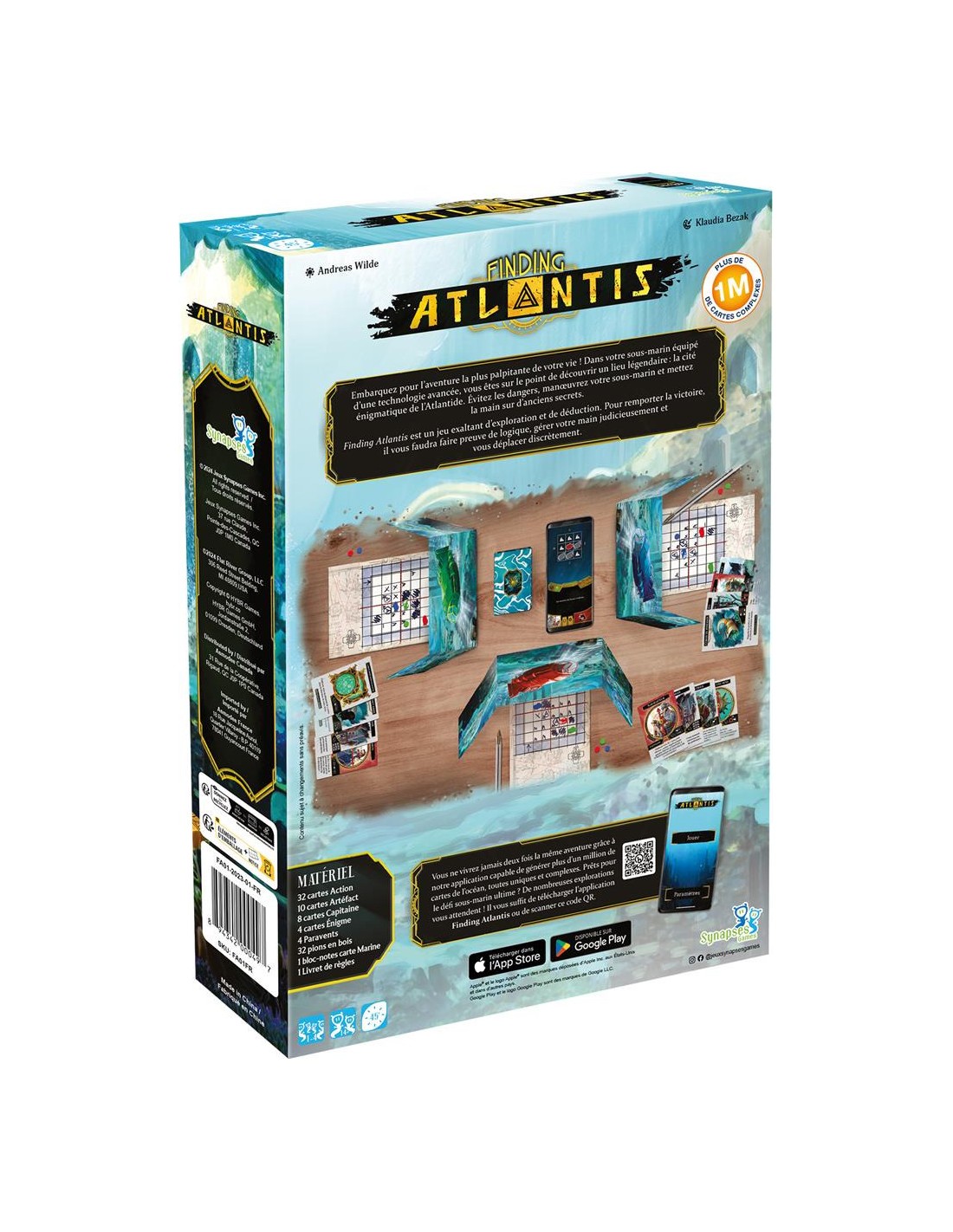 Une forte rafale vous fait lever les yeux. Sous vos pieds, la coque en acier vibre doucement. La mer est encore calme, mais vous sentez venir la tempête. Vous vous rappelez les histoires de votre grand-père au sujet de terres lointaines, d'odeurs exotiques et des sept mers. Même s’il semblait que le monde entier avait déjà été exploré, il rêvait d’un endroit mystérieux, le plus légendaire de tous. « Cet endroit renferme des trésors inestimables et des secrets oubliés depuis bien longtemps, défendus par de dangereux gardiens. » Vos yeux brillaient à cette idée. À cette époque, vous avez juré de trouver l’Atlantide et aujourd’hui, vous possédez quelque chose que votre grand-père n’aurait jamais pu imaginer : un sous-marin. Vous regardez vers l’est et apercevez le sous-marin de votre adversaire à l’horizon : le capitaine Glue est là ! Finding Atlantis est un jeu compétitif d’exploration stratégique et de déduction, avec des cartes uniques de l’océan générées par une application. Pour remporter la victoire, il vous faudra faire preuve de logique, gérer votre main judicieusement et vous déplacer discrètement. Le premier joueur qui parvient à trouver et explorer toutes les zones de la cité engloutie de l’Atlantide gagne la partie. Prépare-toi pour un voyage exaltant sans précédent ! Équipé de technologie de pointe et d'un sous-marin dernier cri, tu t'apprêtes à faire une découverte mythique : celle de l’énigmatique citée de l’Atlantide ! Les joueurs devront tirer des déductions, être stratégiques dans la gestion de leur main et cacher leurs déplacements pour remporter la victoire. Le premier aventurier à découvrir et à parcourir cette citée mythique remportera la victoire et sera à jamais dans les annales de l'histoire.- Un jeu lié à une application :il ne faut qu’un appareil mobile pour jouer à Finding Atlantis. Il suffit de télécharger l’application, configurer le jeu puis c’est parti !