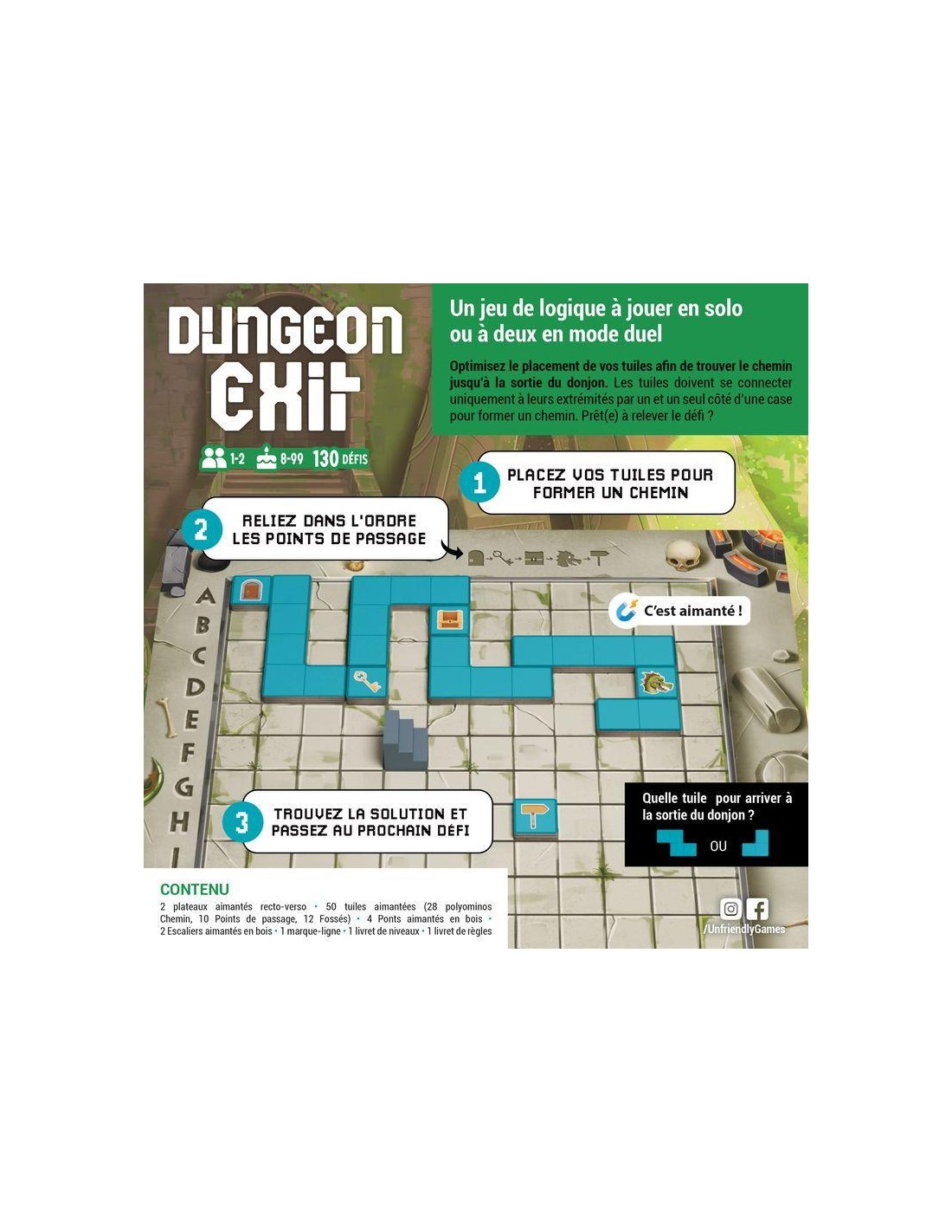 Dans Dungeon Exit, le but est de réussir à trouver un chemin, de la porte jusqu’à la sortie du donjon, en passant par la clé, le coffre, puis le monstre. En solo, résolvez tous les niveaux un à un, progressivement. À 2 joueurs, soyez le plus rapide à trouver un chemin pour remporter la partie.