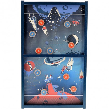 3… 2… 1… décollage immédiat ! Voyagez dans l'espace, à bord du vaisseau Vilac dans ce magnifique jeu de palets au look vintage. Le but est de se débarrasser de tous ses palets avant son adversaire ou, encore plus difficile, de ne plus avoir un seul palet de son côté. Il faut se servir de l'élastique de son côté comme lanceur et être le plus habile pour viser l'unique trou au centre du jeu.